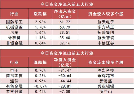 申万一级行业中,14个行业实现资金净流入,其中国防军工行业净流入61.72亿元居首。