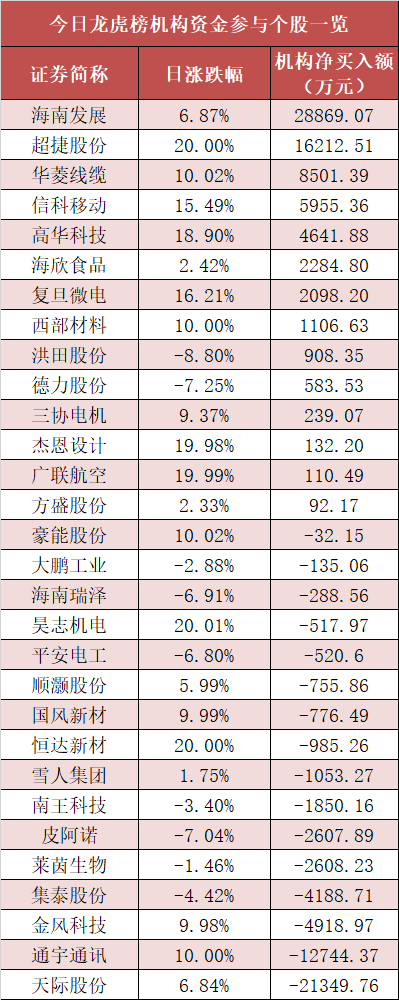 盘后龙虎榜数据显示,机构现身多股,其中海南发展等股票呈现机构资金净买入,天际股份等股票呈现机构资金净卖出。